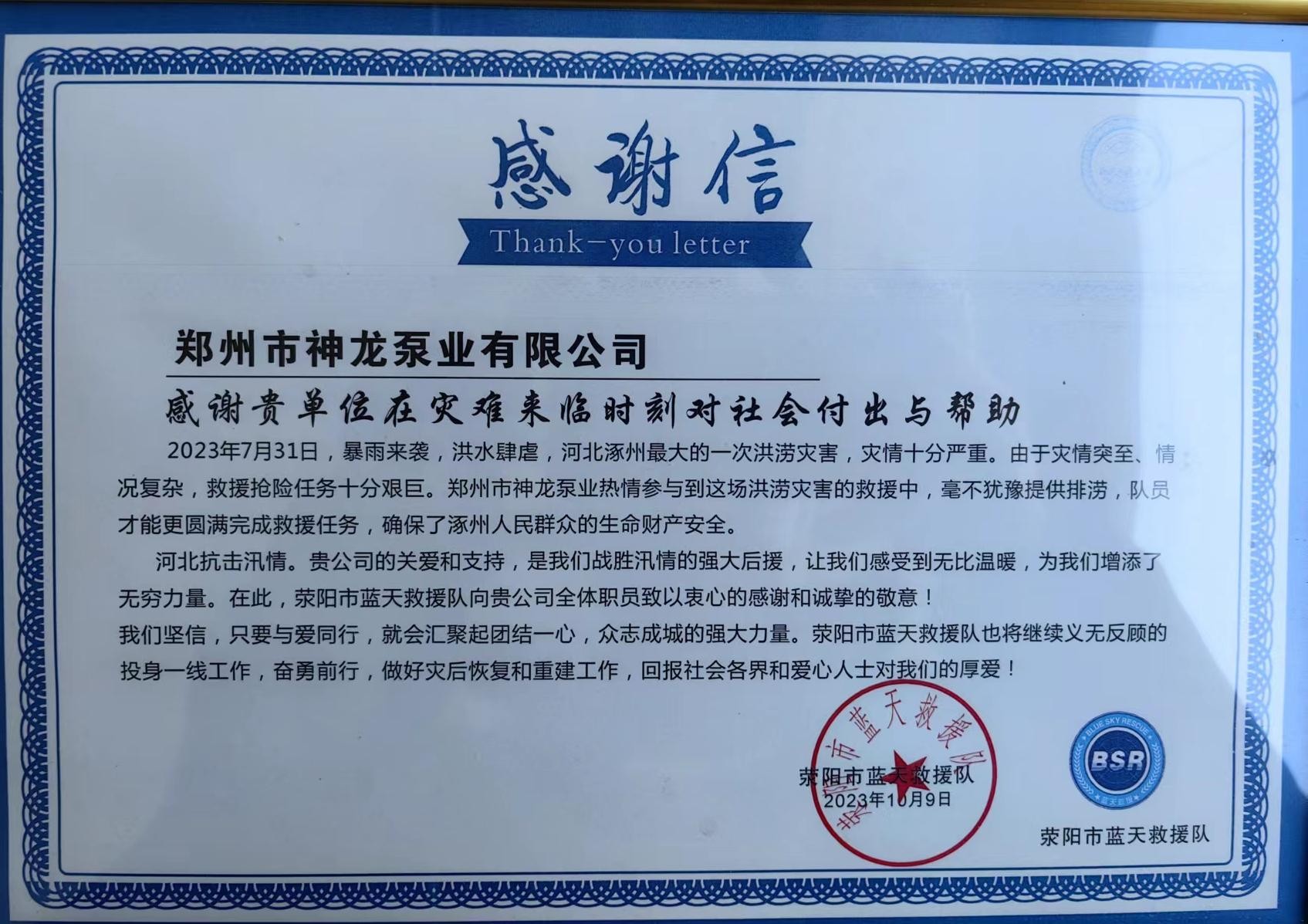 藍(lán)天救援隊(duì)感謝信